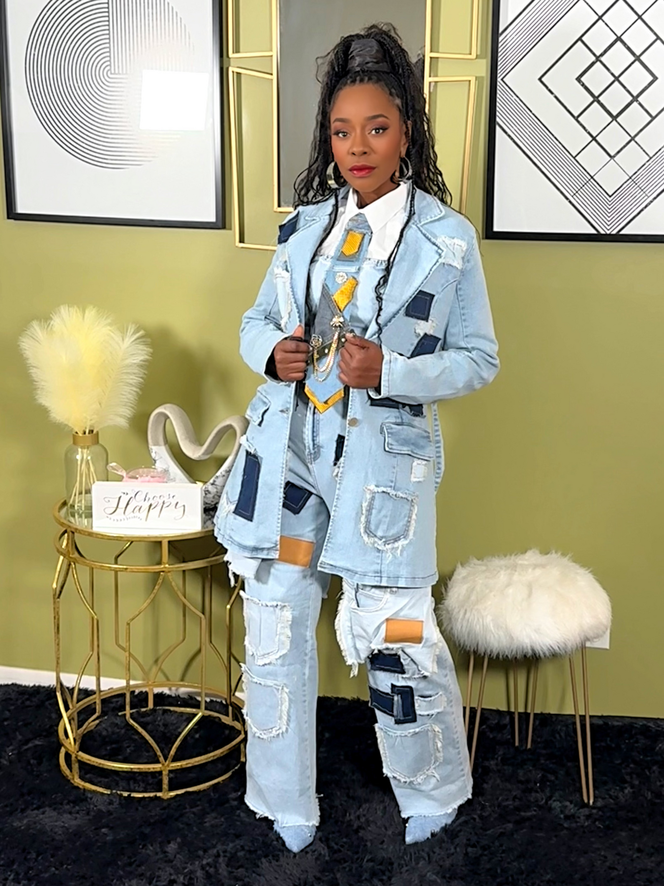 Embrace bold style with the Patch It Up Blazer, featuring a unique patchwork design that demands attention. This single-breasted denim blazer defines edgy sophistication, while the tie belt cinches your waist for a fierce silhouette. Perfectly paired with the Patch It Up Jumpsuit, it’s your go-to for making a confident, daring statement wherever you go.