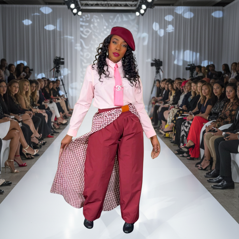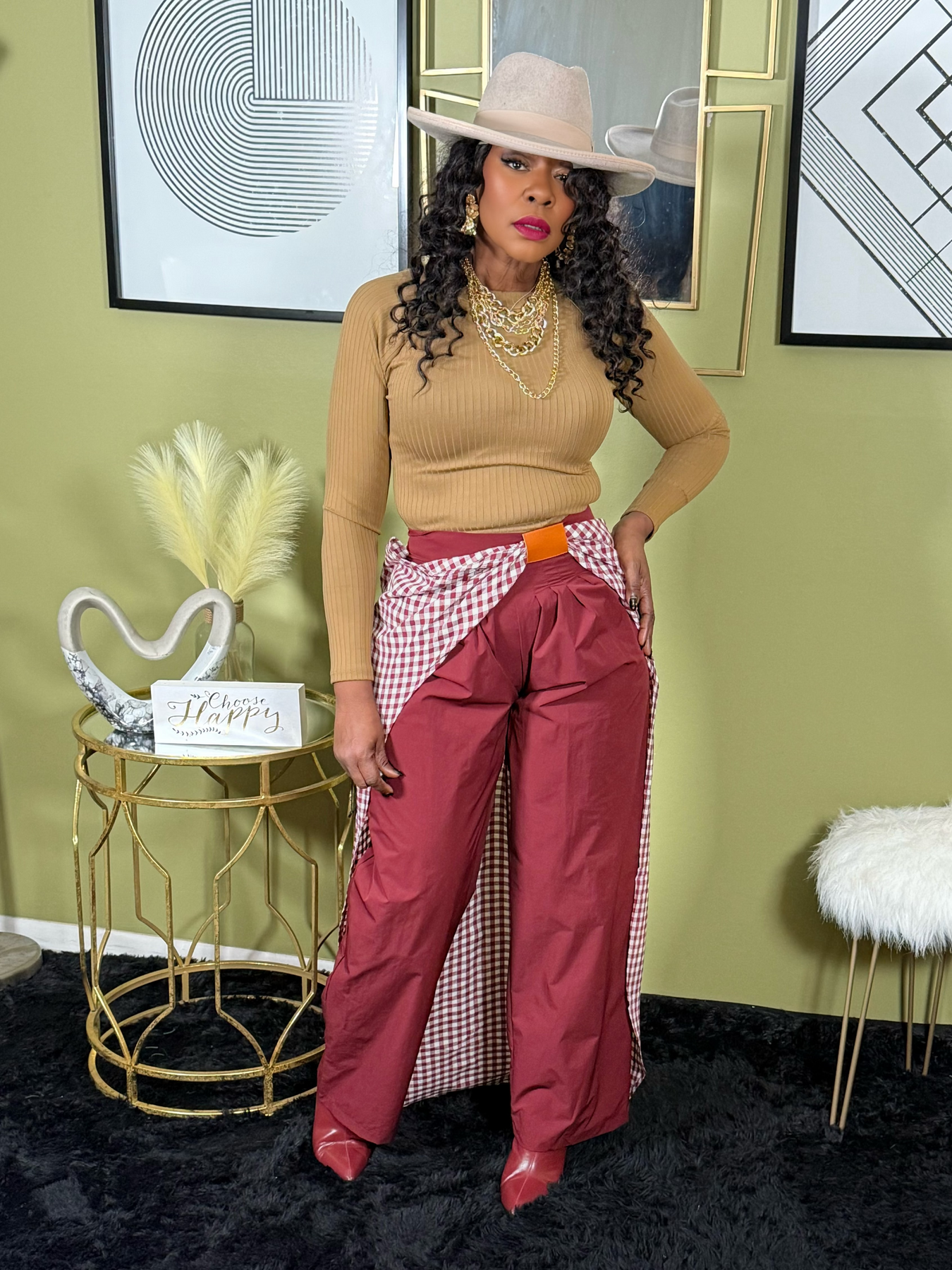 The Couture Chaos Pants are made for the woman who doesn’t dress for approval — she dresses for impact. Featuring a dramatic wide-leg silhouette with a layered gingham wrap detail, these pants give that deconstructed runway energy while still serving rich auntie polish.