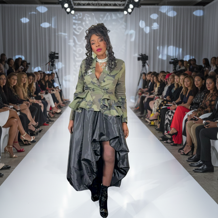 This isn’t your average camo — this is camo couture for the woman who runs the room and the runway. The G.I. Jane Camo Top brings military-inspired edge with rich auntie polish, featuring a deep V neckline, structured blazer-style fit, and a dramatic peplum waist that does what it needs to do… snatch and serve.